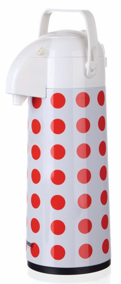Termosz pumpával CULINARIA 1,9 l Pöttyös, a termosz fém héja piros pöttyös dekorral, a pumpa rozsdamentes acél/műanyag kombinációból készült, a fedél, a fogantyú és a talp műanyag, a szigetelő betét üveg .