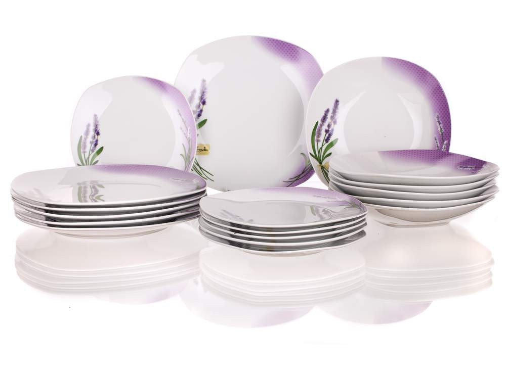 A tányérkészlet finom és elegáns Lavender motívummal vidámmá varázsol minden étkezőasztalt. A készlet 18 szögletes tányért tartalmaz. A tányérok kiváló minőségű fehér porcelánból készültek, használhatók mikrohullámú sütőben és mosogatógépben is moshatók.