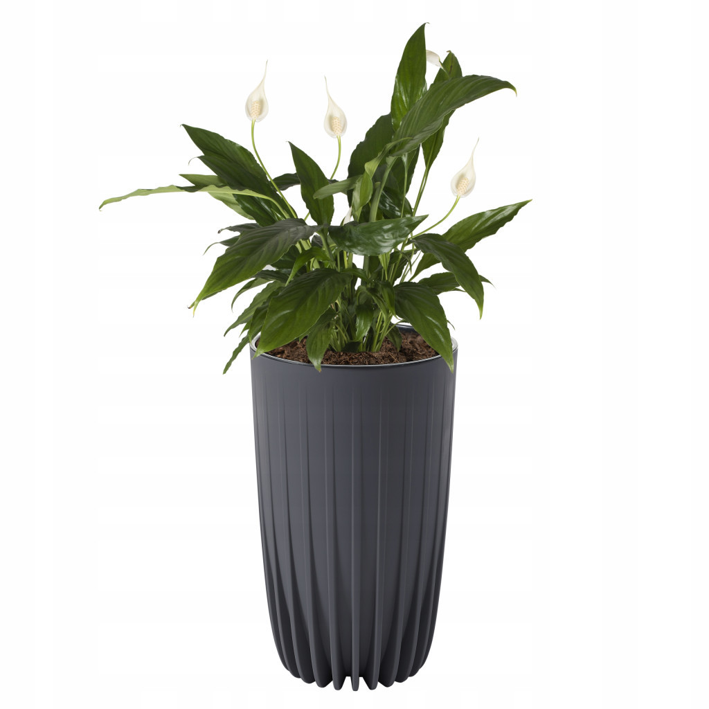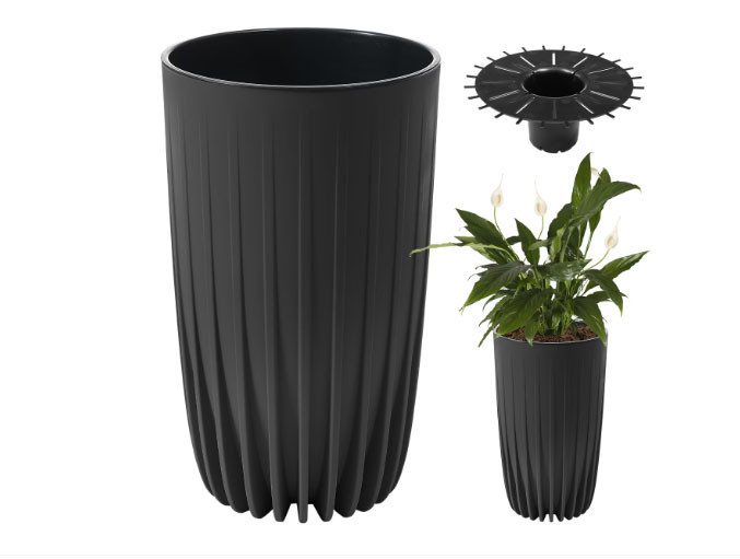 Méretek Felső külső átmérő - 29,3 cm Űrtartalom - 12,5 l Magasság - 51,5 cm A készlet tartalmaz egy nagy edényt + betétet A betét segít fenntartani az ideális növényi hidratációs feltételeket Ellenáll a fagynak és az időjárási viszonyoknak Könnyen tisztán tartható Újrahasznosított műanyag