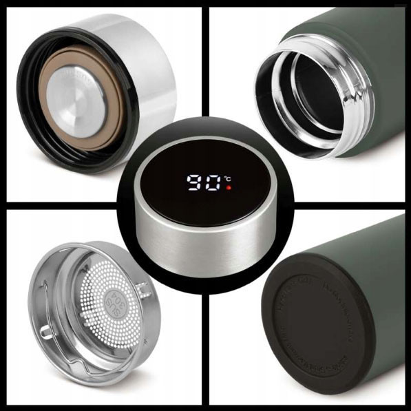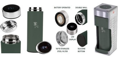 Ez a stílusos, modern LED kijelzővel ellátott kulacs ideális társ a napi hidratáláshoz otthon, a munkahelyen és útközben is. Az intelligens digitális hőmérőnek köszönhetően mindig tudni fogod, mennyire meleg vagy hideg az italod. Az elegáns matt zöld szín és a kiváló minőségű rozsdamentes acél nemcsak praktikus, hanem dizájnos kiegészítővé is teszi. Műszaki adatok: Anyag: Belső test 18/10 rozsdamentes acélból, matt porbevonattal Űrtartalom: 0,5 l Szín: Matt zöld Szűrő: 18/10 rozsdamentes acél tisztítószűrő Akkumulátor: Tartalmazza (nem cserélhető) Tulajdonságok: Beépített digitális hőmérő – A fedélen található LED kijelző mutatja az ital aktuális hőmérsékletét Dupla fal – kiváló hőszigetelés Akár 8 órán át melegen, akár 12 órán át hidegen tartja az italokat Könnyen tisztítható – higiénikus és praktikus használat Kényelmes működés és hordozhatóság Stílusos és modern dizájn - ideális mindennapi használatra és ajándéknak is