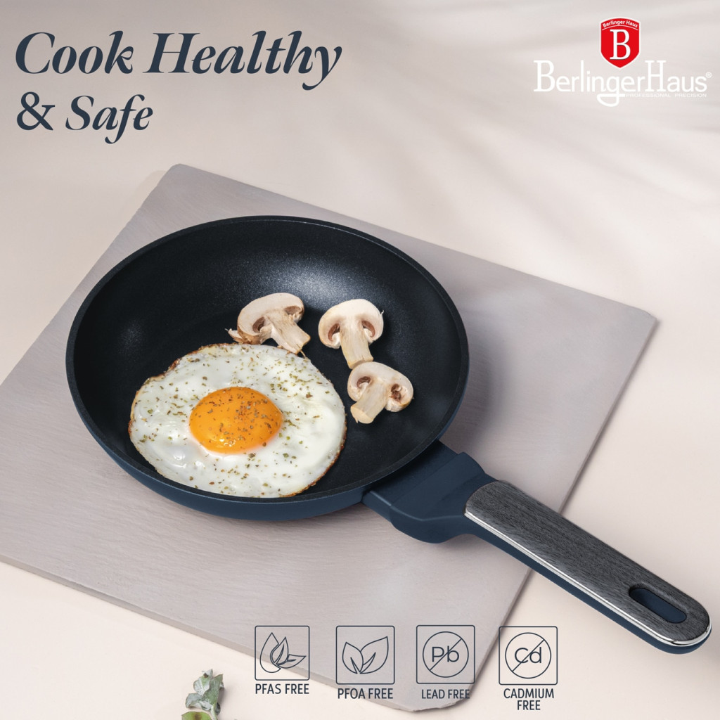 A matt kék felület és a szürke, fa stílusú, ergonomikus, puha tapintású fogantyú eleganciát kölcsönöz konyhájának, akár kényelmes fogást biztosít, amely főzés közben hűvös marad. A turbó indukciós alap akár 35%-kal gyorsabb melegítést és egyenletesebb hőeloszlást biztosít, így minden főzőlaptípussal kompatibilis, beleértve az indukciósat is.