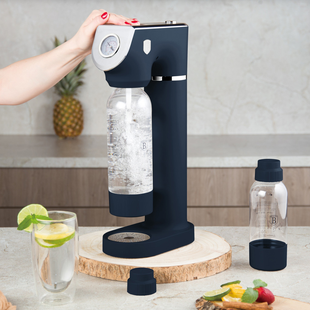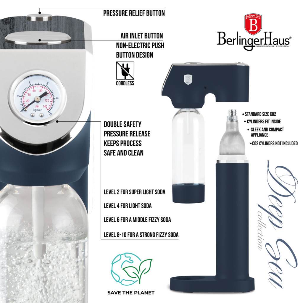 Készíts frissítő szódavizet otthon gyorsan és elegánsan a BerlingerHaus Deep Sea kollekció szódagépével, amely nem elektromos működésű és két újratölthető kulacsot tartalmaz. A matt kék és szürke fa hatású külső dizájn tökéletesen illeszkedik a modern konyhák világába, miközben a rendszeres műanyagpalack-vásárlás is elkerülhető.