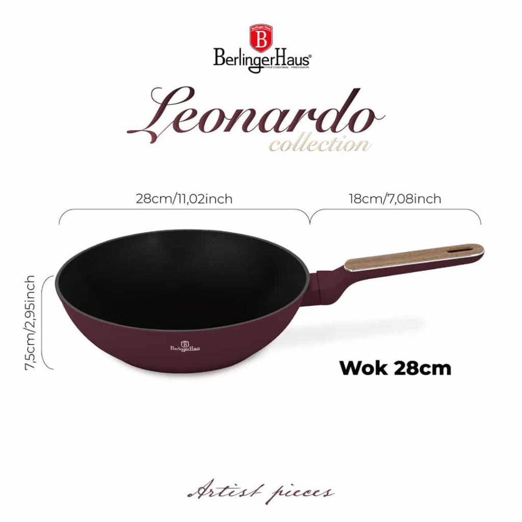 A Leonardo Nordic kollekció részeként a wok matt bordó felülettel , világos, fahatású, puha tapintású nyéllel és ezüst betéttel rendelkezik . Az ergonomikus kialakítás kényelmet és biztonságot nyújt, míg az elegáns skandináv esztétika fokozza a konyhád hangulatát.