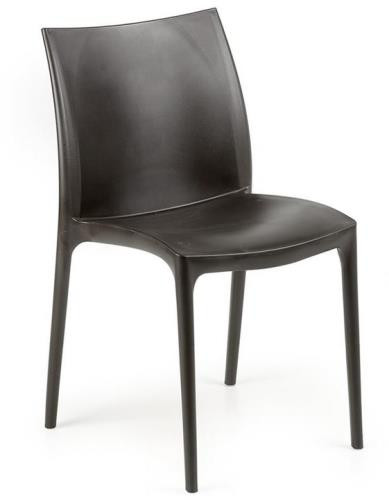 Modern formavilágú, antracit színű műanyag szék, amely kényelmes és sokoldalúan használható megoldás beltéri és kültéri környezetben is.