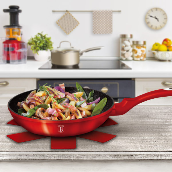 A Berlinger Haus Metallic Burgundy Line kovácsolt alumíniumból készült serpenyő három rétegű márvány bevonata és a turbó indukciós talp lehetővé teszi, hogy ételei energiatakarékosan és gyorsabban elkészüljenek.